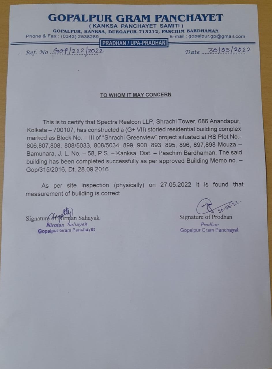 | 1 | Authenticated copy of occupancy certificate and completion certificate including its application | Completion Certificate | CC Tower-1 Green View Project.pdf |